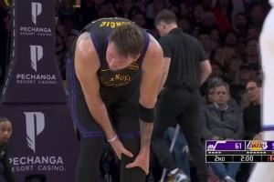 东契奇左小腿不舒服啊!可能被撞到了!