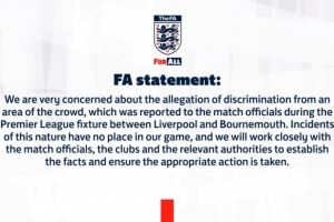 英足总声明:“我们对于在利物浦与伯恩茅斯的英超比赛中,有观众区域传出歧视行为的指控表示高度关注。该指控已在比赛过程中上报给裁判组。”